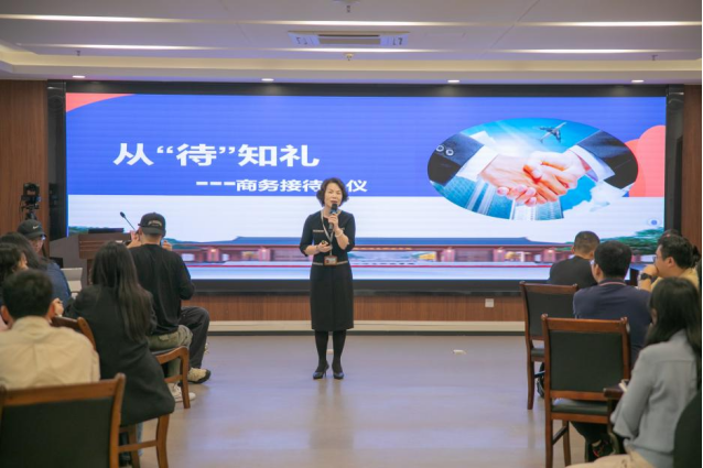 4月11日下午,党政办公室在知行楼818会议室开展“接待礼仪、专家沟通技巧与应答策略”专题培训。本次培训由学校党委副书记李飞主持,各教学单位办公室主任及参与接待工作的全体老师参加培训。