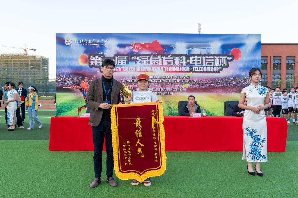 在比赛现场,学校校长助理韩剑和本次比赛独家赞助商桂林市湘婷通讯有限公司总经理覃军来到现场观赛,共同见证了这场足球盛宴。比赛结束后,举行了隆重的颁奖仪式,本次比赛设立了金靴、银靴及金手套奖等个人奖项,以表彰在赛场上表现突出的运动员。金靴奖得主是来自商学院一队的优秀前锋朱冠璋,在本次比赛中他以攻入28球的总进球数“傲绝群雄”,成为最佳射手;银靴奖则由商学院的黄奕森和外贸与外语学院的翟煜博共同获得。金手套奖颁给了商学院一队的主力门将童康铭,他在比赛中多次化解对方极具威胁的进攻,成为球队夺冠的关键人物。