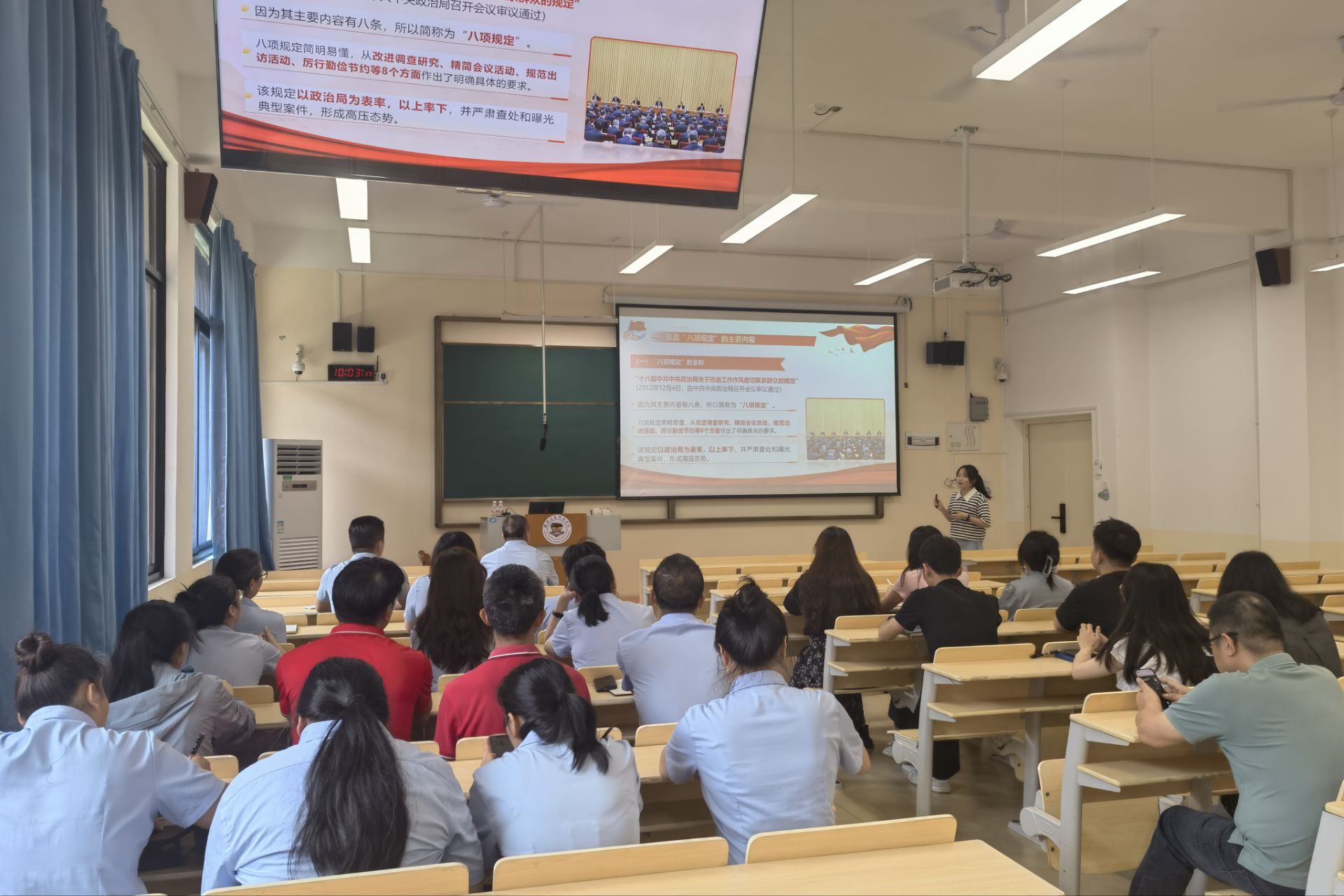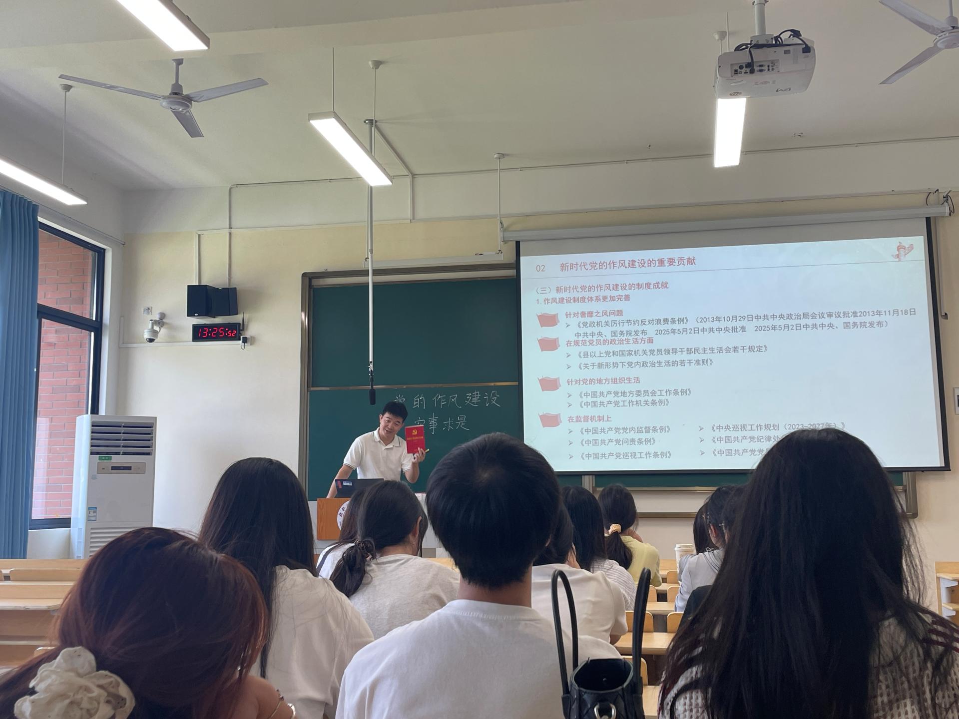 在宣讲活动中,马克思主义学院宣讲团的党员教师围绕全国两会精神、习近平总书记关于党的自我革命的重要思想,以及加强党的作风建设和深入贯彻落实中央八项规定及其实施细则的相关内容进行深入讲解。他们通过生动的实例,帮助师生们深刻理解党的创新理论在国家发展、社会进步和个人成长中的重要指导意义,使理论知识更加贴近实际,同时引导师生将理论与实践紧密结合,从而激发了大家的学习热情和使命感。
