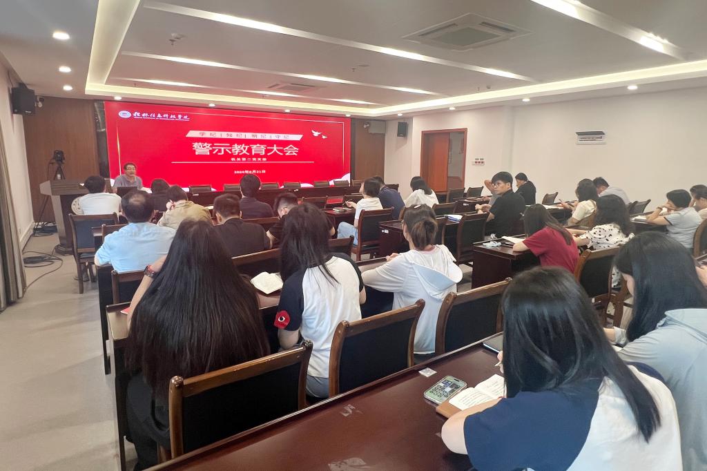 6月21日,机关第二党支部召开警示教育大会,支部全体党员参加会议。会议通报了广西教育系统严重违纪违法典型案例,支部书记张锟主持会议,并讲授纪律教育专题党课。
