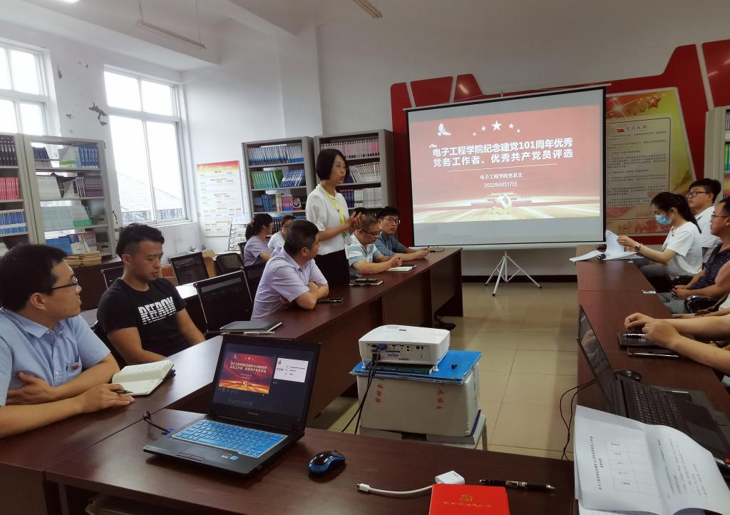 6月17日中午,电子工程学院党总支在41502党员活动室召开庆祝建党101周年优秀共产党员和优秀党务工作者推荐评选会议,本次会议由党总支书记庄璧瑛主持,我院全体教职工党员参加会议。