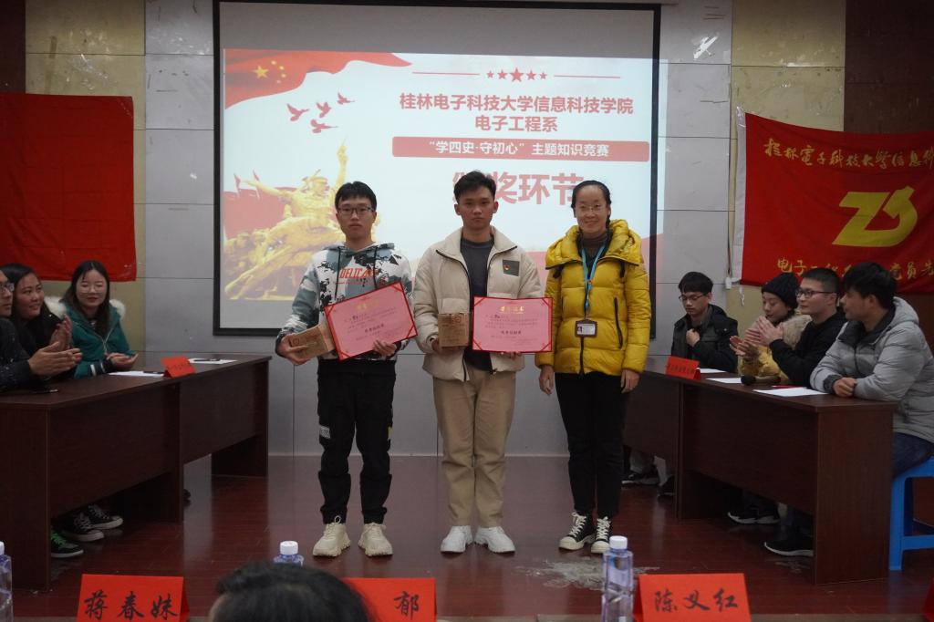 为加强学生党员思想理论建设、加深对四史的了解与学习,12月4日中午,电子工程系党员先锋队在21201报告厅举办“学四史,守初心”主题知识竞赛。学院党群事务部老师蒋春妹,系专职组织员陈义红,先锋队指导老师池锴及各学生党支部书记出席活动。