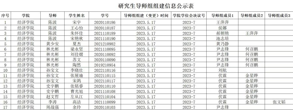 二、研究生导师组原则上应在该生学位论文开题前组建,组建后不得随意变更。学院导师组详细名单和具体信息附后,以供相互监督。研究生导师组的日常管理由研究生导师和培养单位共同负责,研究生导师作为研究生培养第一责任人的职责不变。