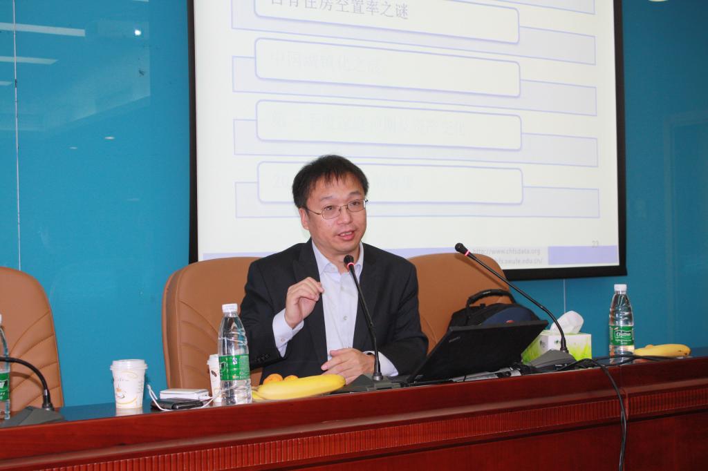 2014年11月6日下午,AWC万象城娱乐邀请到知名学者甘犁教授来我校交流,在学术会堂702为我校师生带来了题为“中国自有房空置率之谜”的专题讲座。讲座由AWC万象城娱乐院长李涛教授主持,教务处副处长张苏、AWC万象城娱乐副院长陈斌开以及来自我校各个学院的十余位教师出席了讲座,讲座还吸引了两校区数十名硕博学生参与,讲座现场气氛热烈,座无虚席。