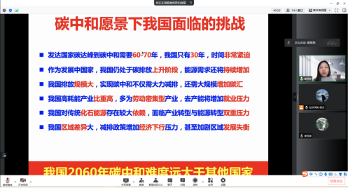 唐葆君老师分析了全球气候变化的主要驱动因素,并介绍了国际上为应对气候变化的所做的努力,碳中和是实现温控目标的必然选择,碳中和的实现是通过减少碳排放并增加碳汇使源汇平衡。面向碳中和愿景下我国面临的机遇和挑战,能源转型是实现碳减排的最有效的途径,而工业是我国碳排放的主要部门,针对我国电力、钢铁、水泥、化工等行业和交通、建筑运行等部门,分析工业碳排放居高不下的主要原因,关键在于摆脱对煤炭的高度依赖。