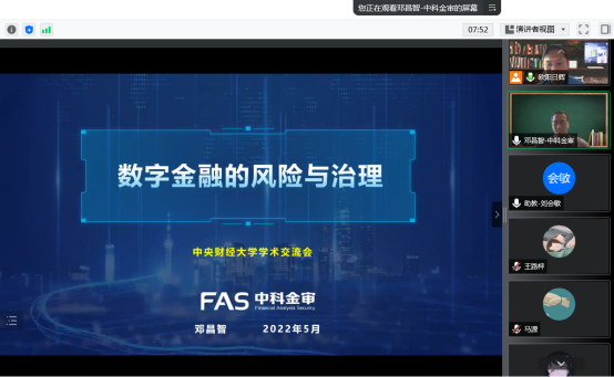 2022年5月30日上午10点,中科金审(北京)科技有限公司总裁邓昌智博士应邀加入AWC万象城娱乐“数字金融理论与实务”线上课堂,以“数字金融的风险与治理”为题,为同学们带来了一场精彩纷呈的讲座。