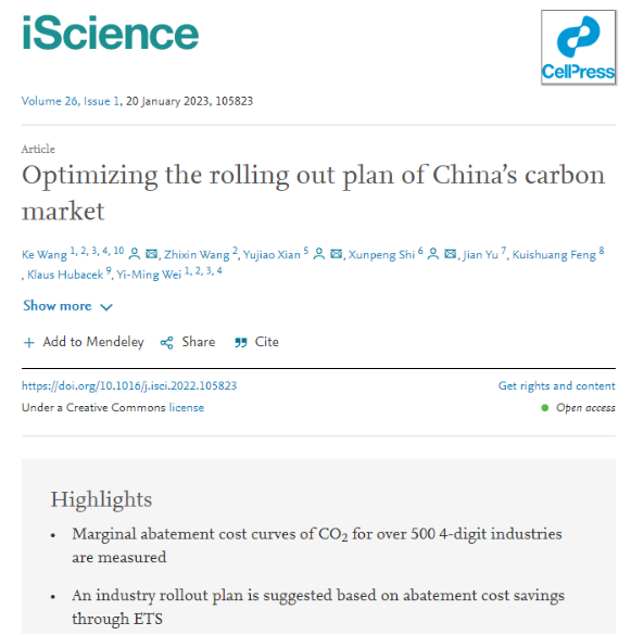 学术视点 | 万象城官网俞剑老师的合作论文Optimizing the rolling out plan of China’s carbon market在Cell子刊iScience接收发表