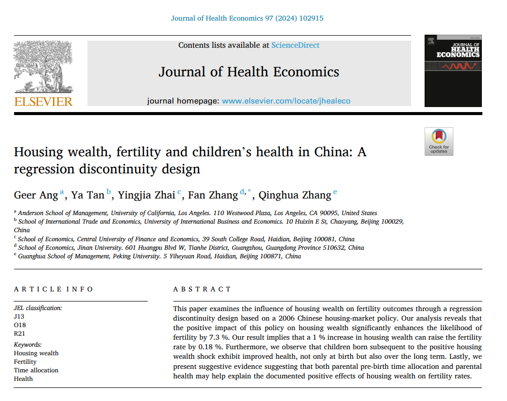 摘要:本文通过基于2006年中国房地产市场政策的断点回归考察了住房财富对生育结果的影响。分析表明,该政策对住房财富的积极影响显著提高了7.3%的生育可能性,住房财富每增加1%,生育率可提高0.18%。此外,研究还观察到在住房财富增加之后出生的孩子,在出生时的健康状况有所改善,并且这一积极效应还会持续影响孩子的长期发展。最后,研究指出父母在孩子出生前的时间分配以及父母的健康状况可能有助于解释住房财富对生育率的积极影响。