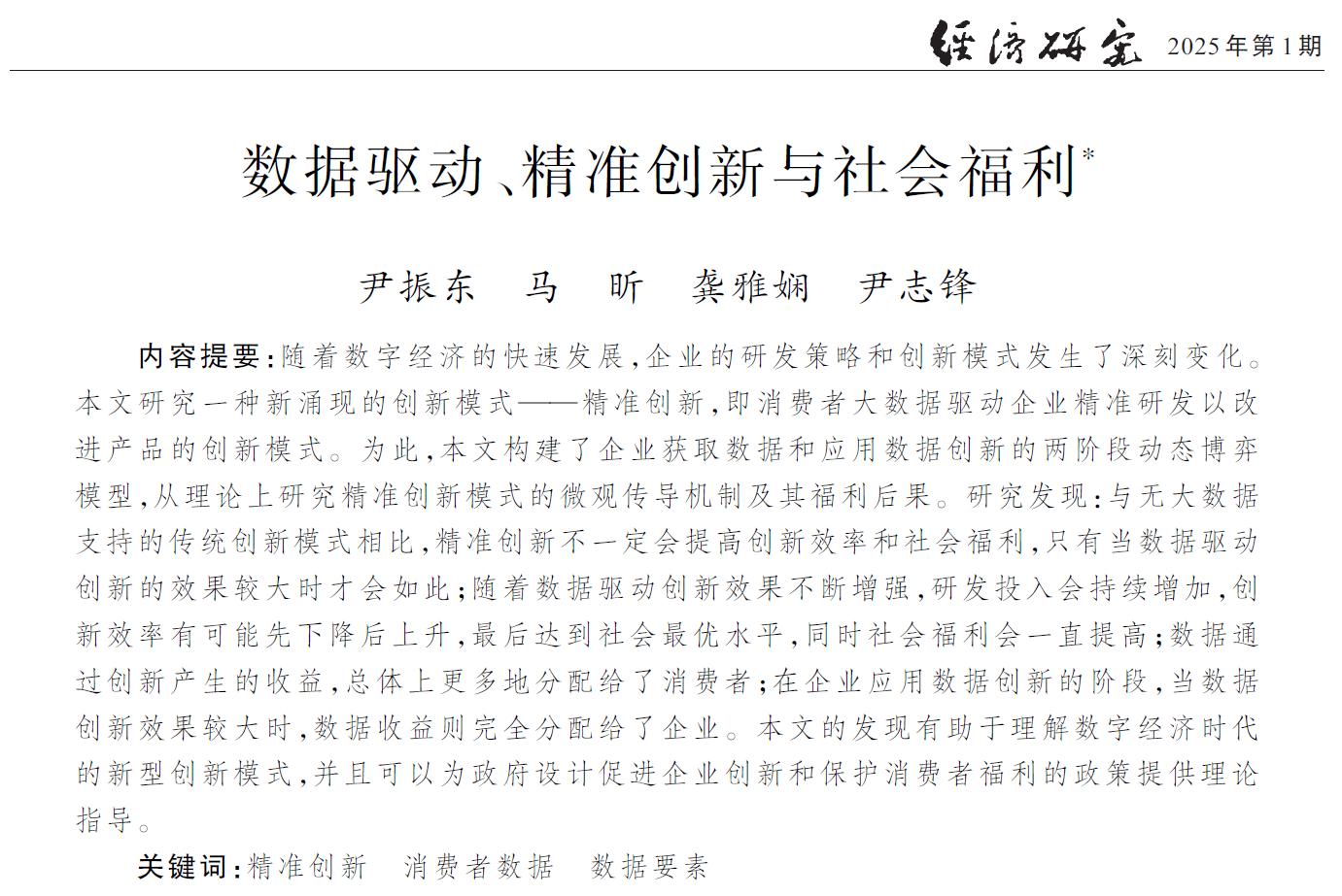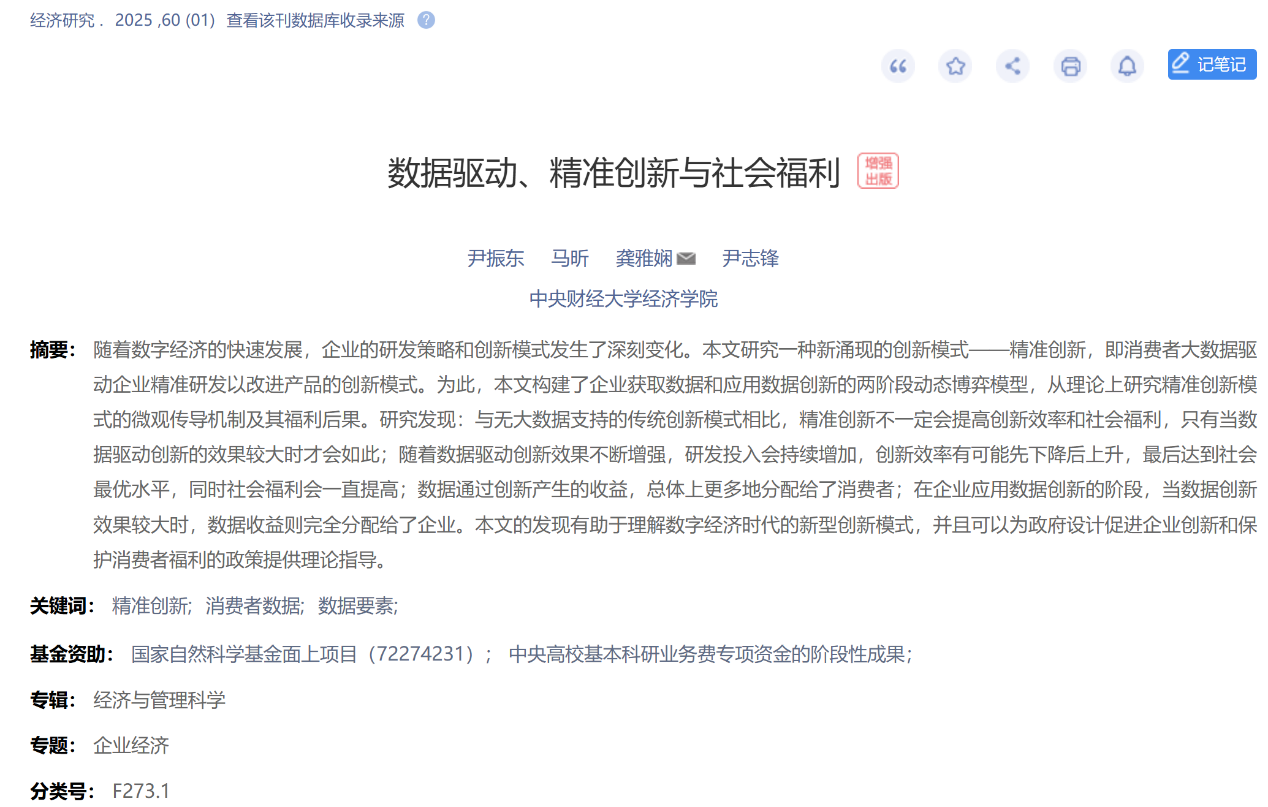 摘要:随着数字经济的快速发展,企业的研发策略和创新模式发生了深刻变化。本文研究一种新涌现的创新模式——精准创新,即消费者大数据驱动企业精准研发以改进产品的创新模式。为此,本文构建了企业获取数据和应用数据创新的两阶段动态博弈模型,从理论上研究精准创新模式的微观传导机制及其福利后果。研究发现:与无大数据支持的传统创新模式相比,精准创新不一定会提高创新效率和社会福利,只有当数据驱动创新的效果较大时才会如此;随着数据驱动创新效果不断增强,研发投入会持续增加,创新效率有可能先下降后上升,最后达到社会最优水平,同时社会福利会一直提高;数据通过创新产生的收益,总体上更多地分配给了消费者;在企业应用数据创新的阶段,当数据创新效果较大时,数据收益则完全分配给了企业。本文的发现有助于理解数字经济时代的新型创新模式,并且可以为政府设计促进企业创新和保护消费者福利的政策提供理论指导。