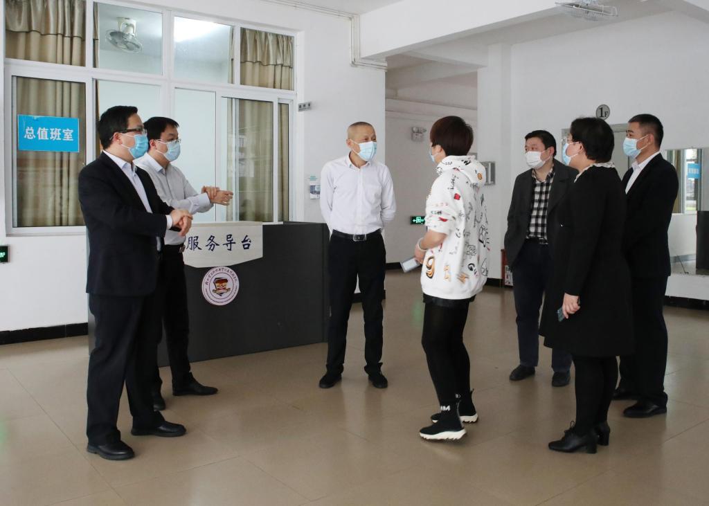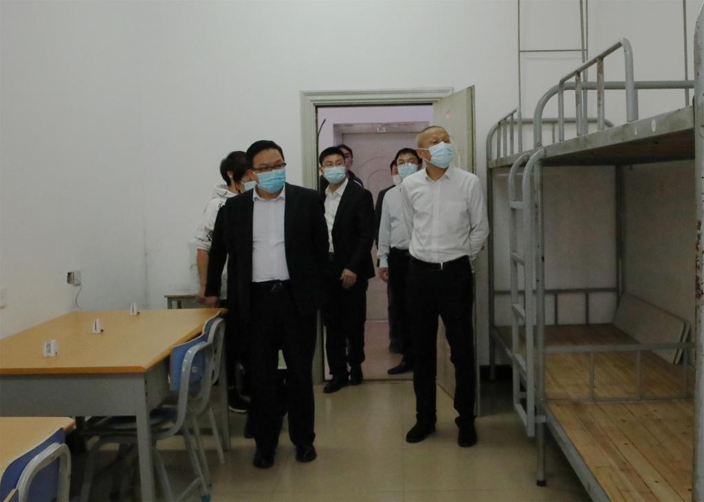 为确保学生安全顺利返校,从严从紧从实抓好校园疫情防控工作。3月11日下午,学校领导梁丁丁、甘勇、唐步洲、李飞、韩剑一行到校大门、学校食堂、疫情防控总值班室、医学观察区、学生公寓、卫生所慰问一线岗位工作人员,实地了解学生返校各项筹备工作及疫情防控措施落实情况。相关职能部门负责人陪同检查。