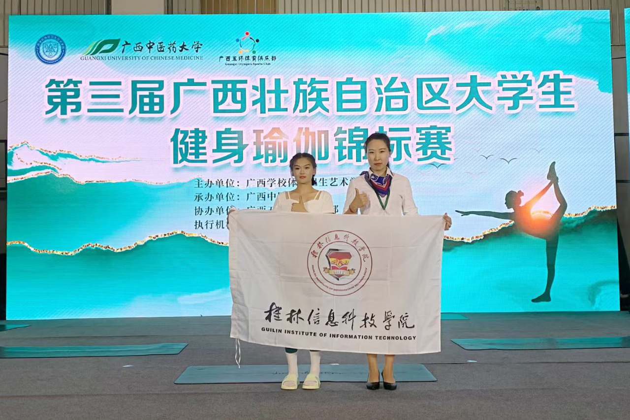 近日,由广西学校体育卫生艺术学会主办第三届广西壮族自治区大学生健身瑜伽锦标赛在广西中医药大学顺利举行。sjb世俱杯体育与健康学院王蕊、钟依岑两位老师带队参赛,周韦霜同学荣获体育专业组女子单人冠军。