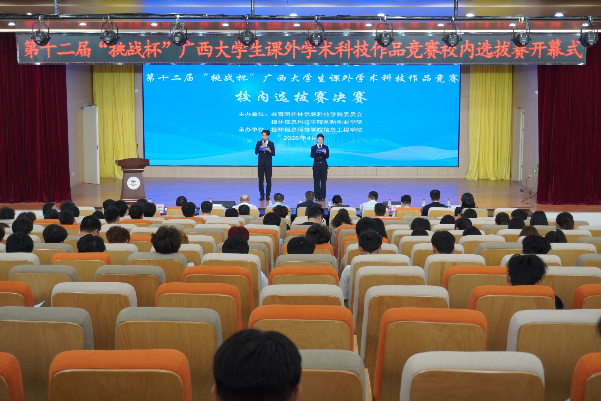 4月21日,学校第十二届“挑战杯”广西大学生课外学术科技作品竞赛校内选拔赛决赛在F107报告厅顺利举行。学校党委副书记、工会主席李飞,学校纪委书记、校长助理周璇出席活动开幕式。此次大赛由学校团委主办,创新创业学院协办,信息工程学院团委承办,校内外评委专家、相关职能部门负责人、学院师生代表等400余人参加活动。