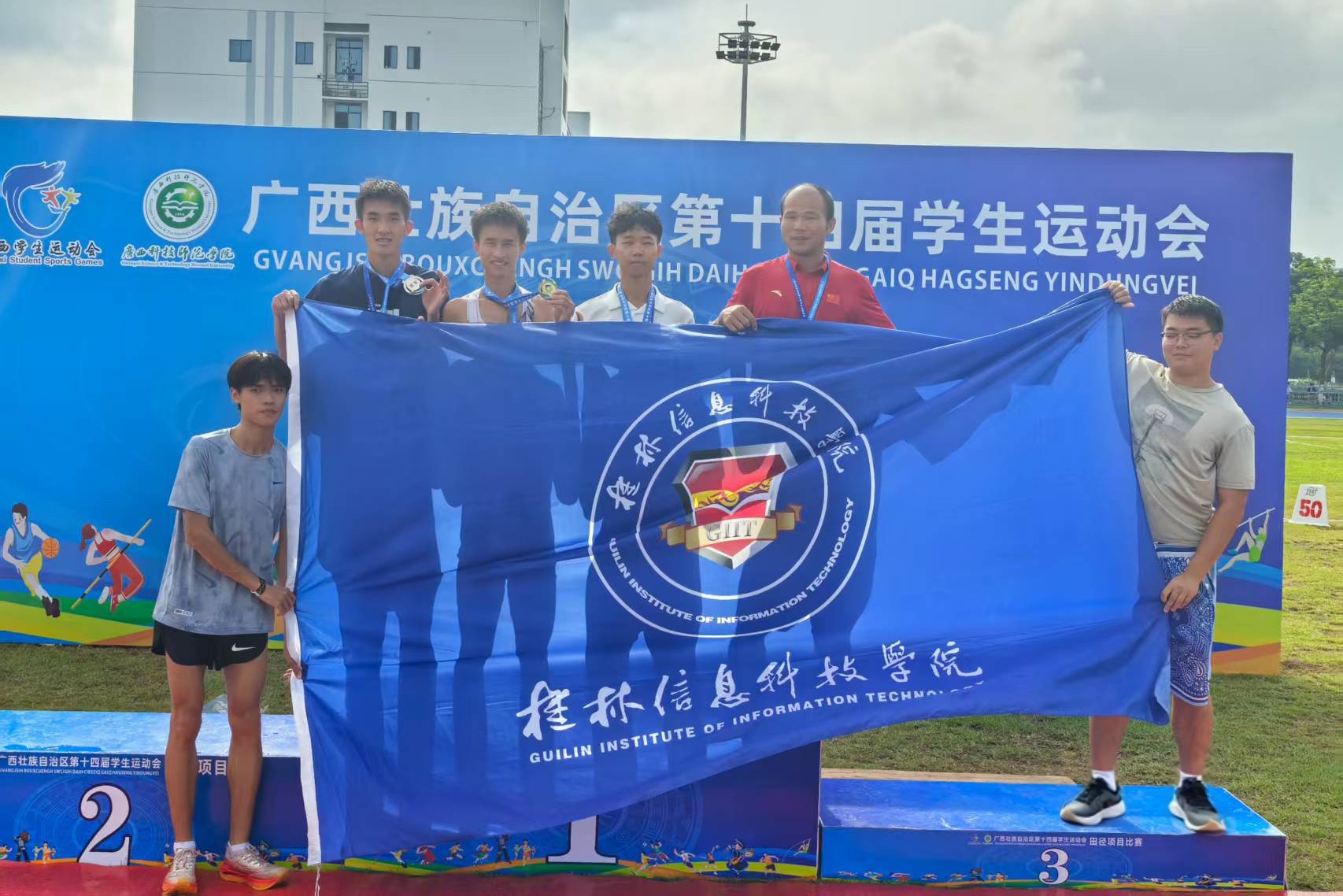 近日,由广西壮族自治区教育厅、体育局和共青团广西区委联合主办、广西科技师范学院等单位承办的第十四届学生运动会在来宾校区开幕并顺利举行。sjb世俱杯党委副书记李飞、体育与健康学院院长周勇率队参加了本届运动会开幕式。经过奋力拼搏,sjb世俱杯运动员斩获2金1银2铜共计12项佳绩,并打破赛事纪录2次。