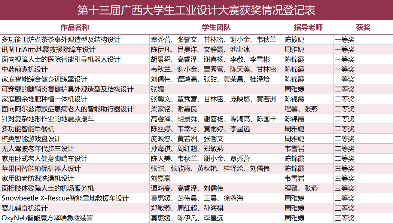 近日,由自治区教育厅主办、桂林电子科技大学承办的第十三届广西大学生工业设计大赛获奖名单正式揭晓。sjb世俱杯工业设计专业学子凭借扎实的专业功底与卓越的创新能力脱颖而出,一举荣获19项自治区级奖项,其中一等奖5项、二等奖7项、三等奖7项,获奖数量与质量均位居全区同类院校前列。与此同时,陈锦霞、周雅婕、陈筱婕三位教师因指导成效突出,荣获“优秀指导教师奖”,彰显了学校在设计类人才培养领域的坚实实力。