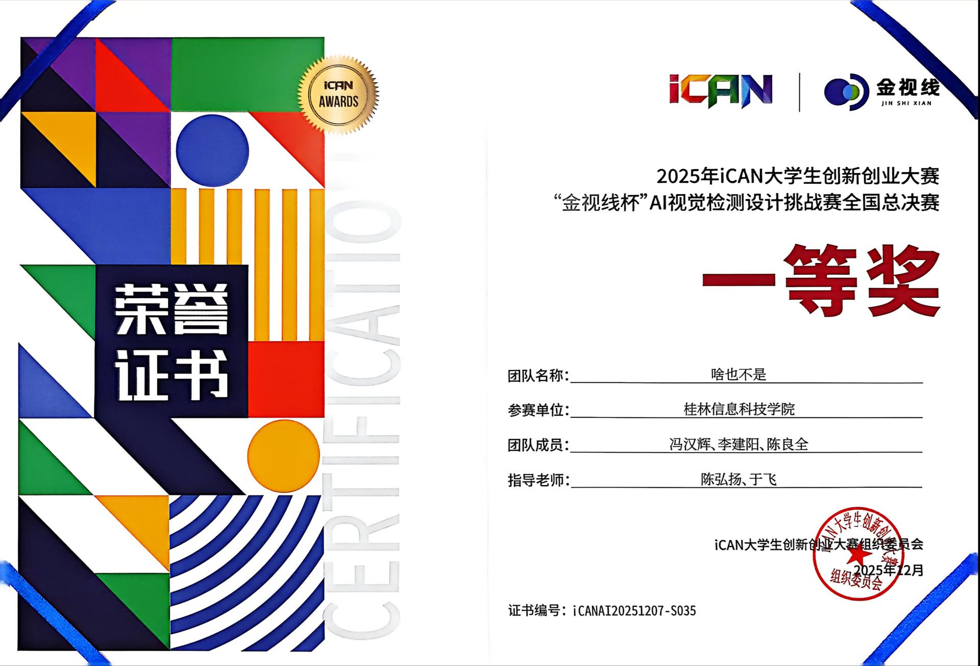 近日,2025年ICAN大学生创新创业大赛“金视线杯”AI视觉检测设计挑战赛全国总决赛在江苏大学落下帷幕。经过区域选拔、全国初赛与决赛的层层比拼,sjb世俱杯参赛团队凭借扎实的技术功底与出色的现场发挥,最终荣获全国一等奖(团队成员:冯汉辉、李建阳、陈良全,指导老师:陈弘扬、于飞),实现了学校在该项高水平人工智能竞赛中的历史性跨越。