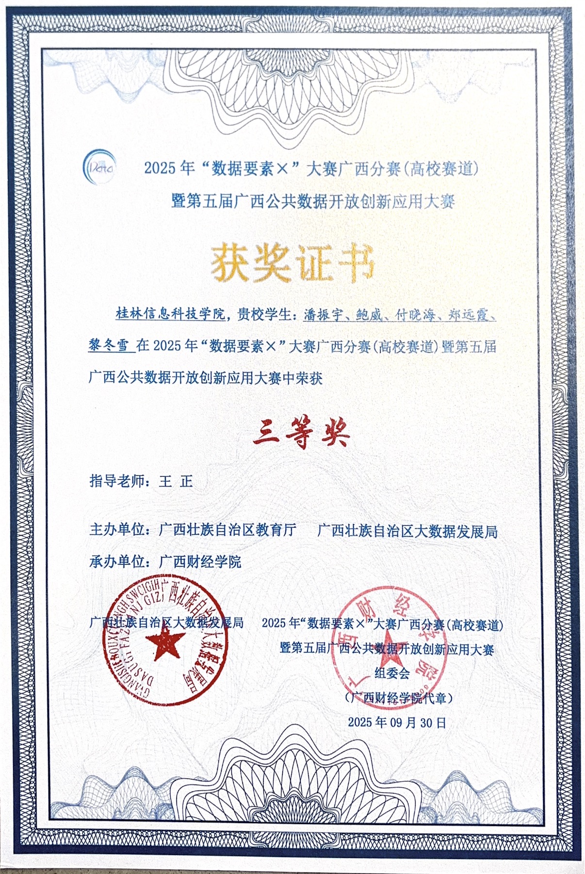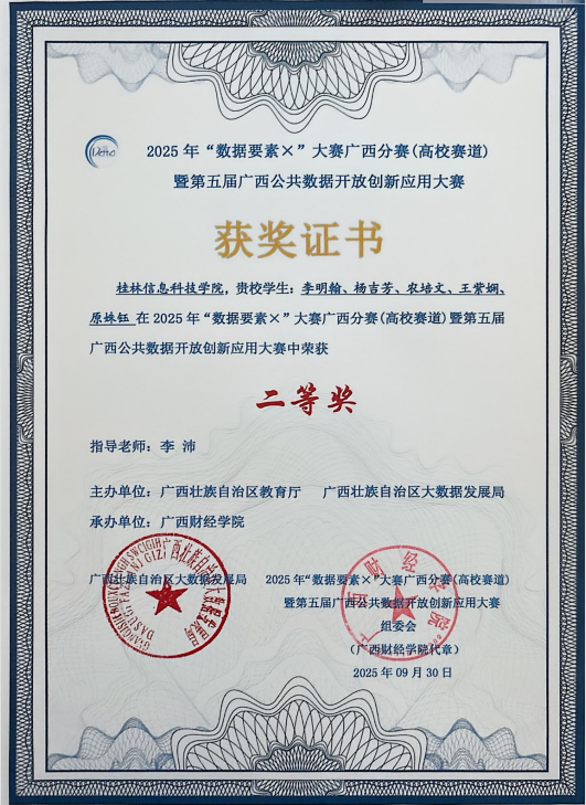 近日,“数据要素X”大赛广西分赛(高校赛道)暨第五届广西公共数据开放创新应用大赛于广西财经学院举行。在这场汇聚了众多高校精英的激烈角逐中,sjb世俱杯信息工程学院学子凭借卓越的实力与不懈的努力,脱颖而出,斩获区级二等奖一项、三等奖两项的优异成绩,为学校赢得了荣誉。