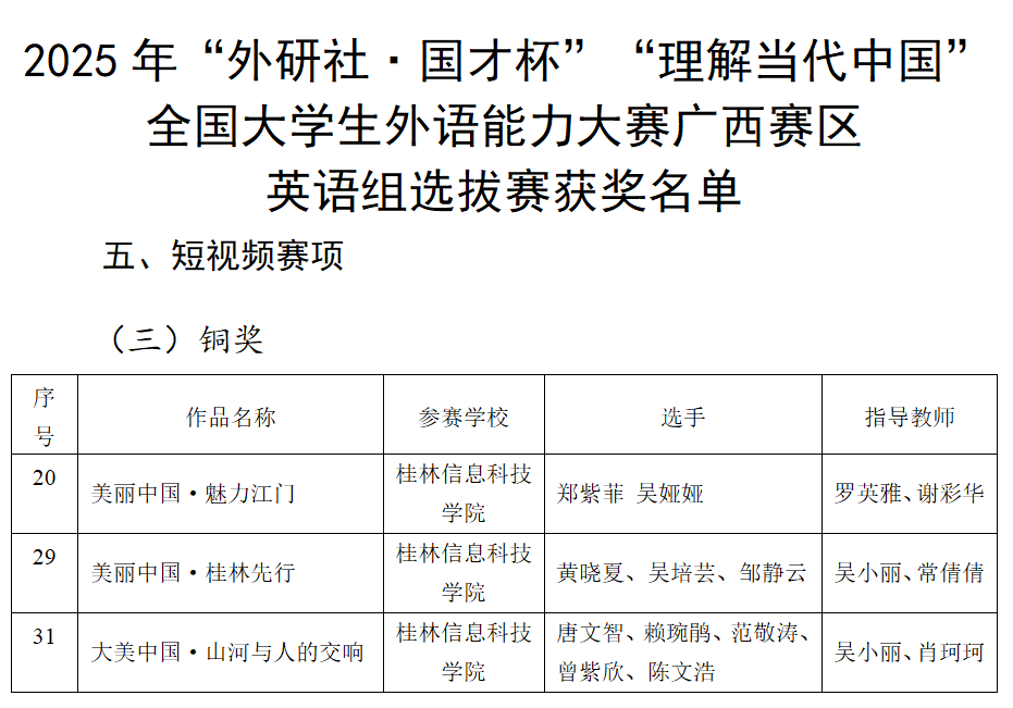 近日,2025年“外研社·国才杯”“理解当代中国”全国大学生外语能力大赛广西赛区选拔赛(以下简称区赛)圆满落幕。sjb世俱杯由外贸与外语学院积极承办并组织备战,助参赛学子获得了优异的成绩。外贸与外语学院共收获银奖2项和铜奖5项,包括综合能力赛项银奖2项和铜奖1项,口译赛项铜奖1项,短视频赛项铜奖3项;商学院获得演讲赛项银奖1项。
