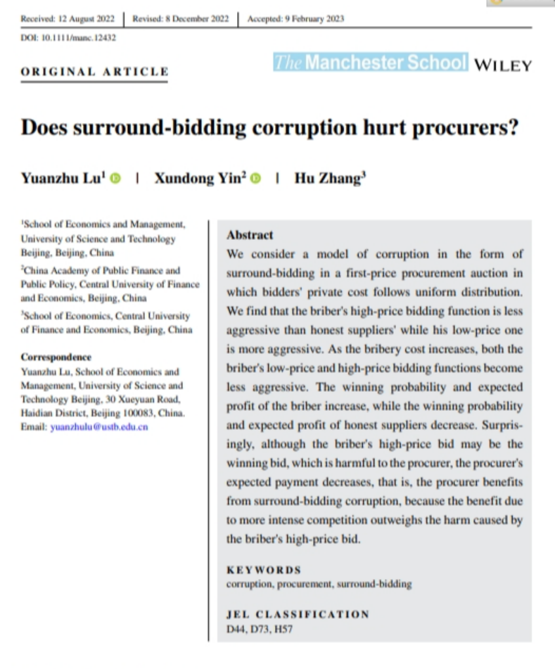 摘要:本文分析了在一级价格拍卖模型中的围标的问题。模型设定招标单位负责人与某个竞标者合谋,允许其以两个身份出两个竞价。我们发现,行贿者竞拍的高价格将会高于平常的同类型的竞标者的出价,而行贿者竞拍的低价格将会低于同类型的忠实竞标者出价。此外,行贿人的中标概率和期望收益都会高于其他非竞标人。本文得到的另一个结论是:由于围标造成多出一个竞标人的假象,加剧了所有投标者的竞争,使得其他竞标人出价增加。这给招标单位带来的收益远高于由于行贿者的高价格中标造成损失。也就是说招标单位负责人受贿允许围标,反而更有利于招标单位的利益。