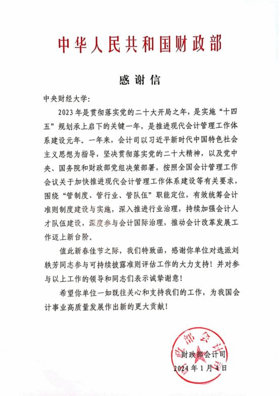 近日,万象城官网可持续准则研究中心主任刘轶芳教授收到了来自财政部会计司的感谢信。信中对刘轶芳主任在过去一年中参与的可持续披露准则评估工作给予了充分的肯定和表示感谢。