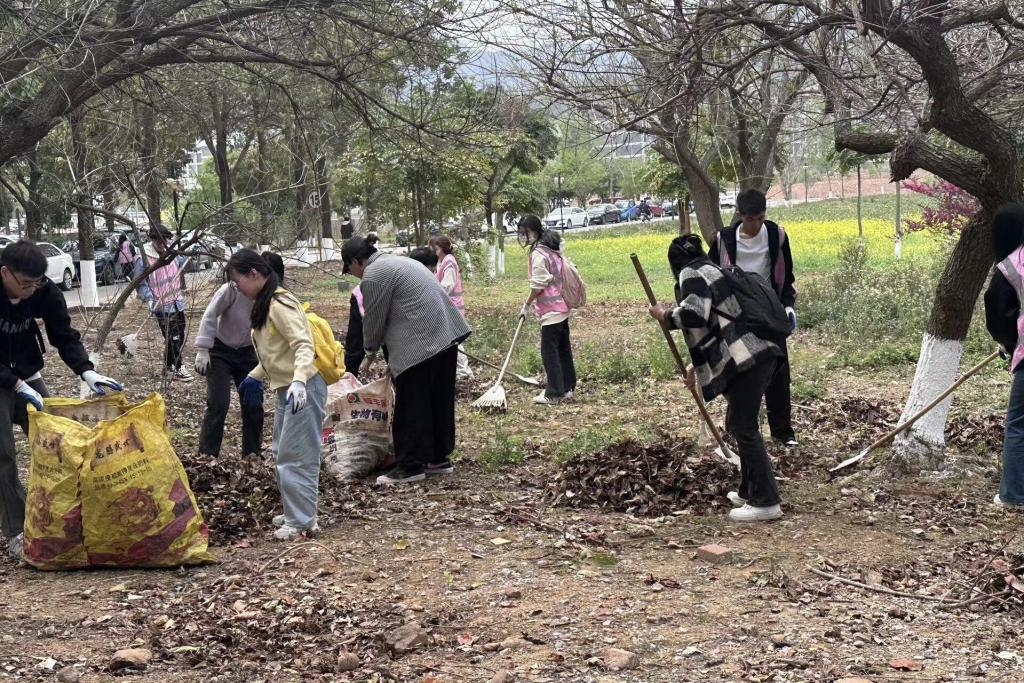 志愿者们对应分组,清扫第三、第四教学区域落花落叶,并协助保洁人员将生活垃圾搬运至指定区域。经过志愿者的努力,第三、第四教学区域的堆积落叶、生活垃圾都得到有效清理,环境焕然一新。