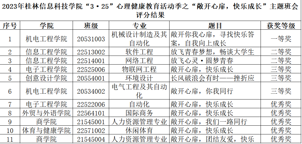 本次评比活动要求各学院以班级为单位全面开展“敞开心扉,快乐成长”主题班会,以“快乐成长”建设为主线,集中开展全校大学生心理健康教育普及性活动,加强人文关怀和心理疏导,营造有利于大学生身心健康发展的良好氛围。班会设计报送材料内容包括:主题班会内容构成及操作流程、效果总结、活动照片等,今年新增一项加分内容,参与申报的指导老师可自愿选择提供班会活动现场的照片、视频剪辑短视频材料。各学院先进行院内选拔,选出优秀主题班会参与校级评比。