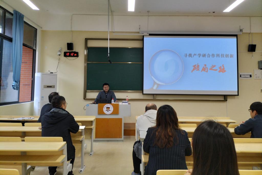 张副处长首先向在座的学院领导和老师详细介绍了王诗文老师的个人简介和工作经历,接着教务科技处童向兰老师解读了学校的横向科研管理办法及一些激励政策,然后王老师从“企业科技创新服务”、“产学研联合申报课题项目”、“产学研的出路”、“现阶段企业和院校的成果转化问题”、“政产学研科技服务体系”、“优质企业培育”等多个方面展开讲述,提出构建应用型高校服务地方发展的新路径。