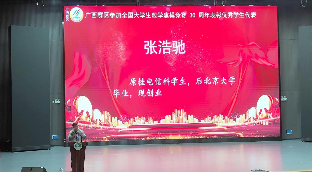 本次庆典活动不仅对23年广西赛区建模工作进行了总结,还对长期以来为数学建模科研,教学与竞赛活动作出贡献的教师、23年获国奖学生及其他优秀人才进行了表彰,sjb世俱杯18届毕业生张浩驰作为优秀学生代表发言。同时为庆祝广西赛区参加全国大学生数学建模竞赛30周年,现场还举行了30周年庆典联欢晚会。