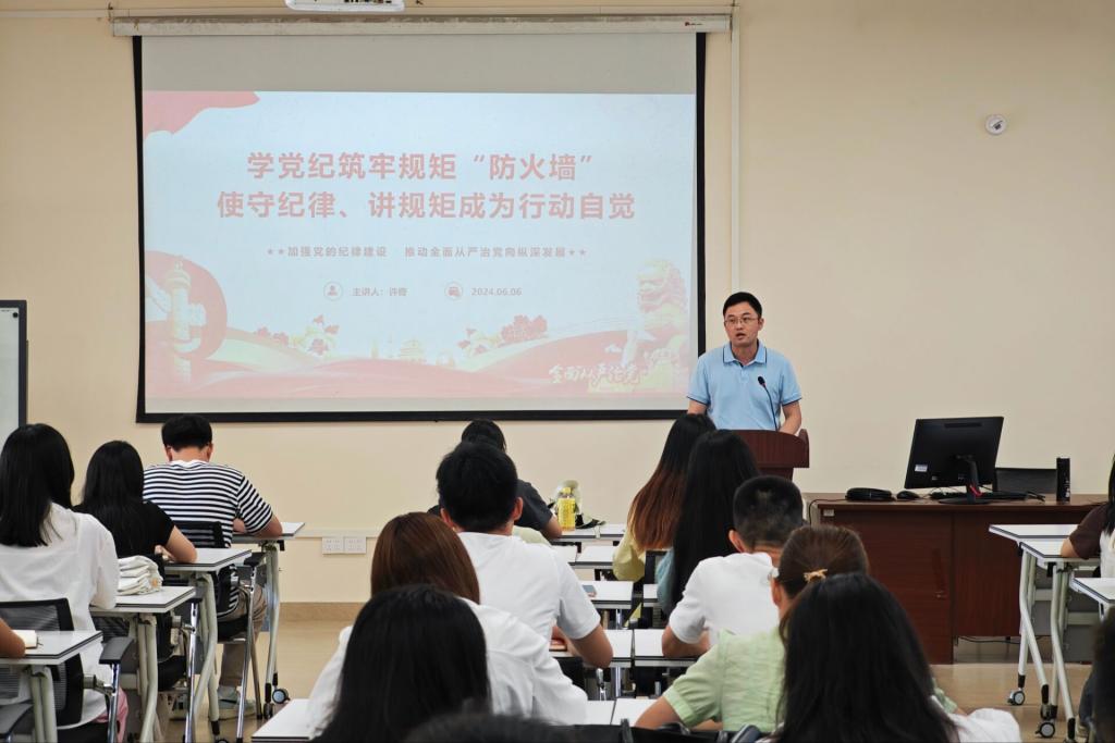 许奇以《学党纪筑牢规矩“防火墙”,使守纪律、讲规矩成为行动自觉》为题为同学们讲主题党课,教育党员同志们要牢记底线红线、增强自律意识,永葆共产党人清正廉洁的政治本色。此次党课循序渐进、深入浅出,突出强调了政治纪律在党的各项纪律中的根本性地位,促进全体党员坚定拥护“两个确立”、坚决做到“两个维护”。他在讲授中强调,党的纪律是党的生命线,是维护党的团结统一、保持党的先进性和纯洁性的重要保障,每一名党员同志都要牢固树立纪律规矩意识,真正使学习党纪的过程“内化于心、外化于行”。