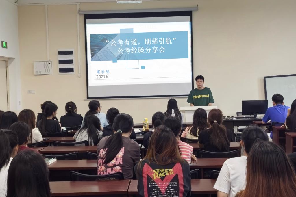 为帮助学生做好职业规划,明确就业选择路径,提高学生就业质量,商学院于6月17日举办了“公考有道,朋辈引航”公考经验分享会,让计划参加公务员考试的学生们能够从经验丰富的学长处获得实用的备考策略和应试技巧。2024届毕业生唐晓富应邀分享经验。