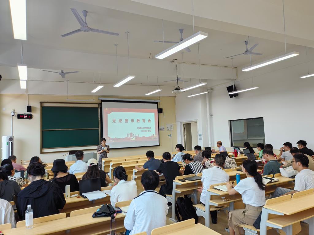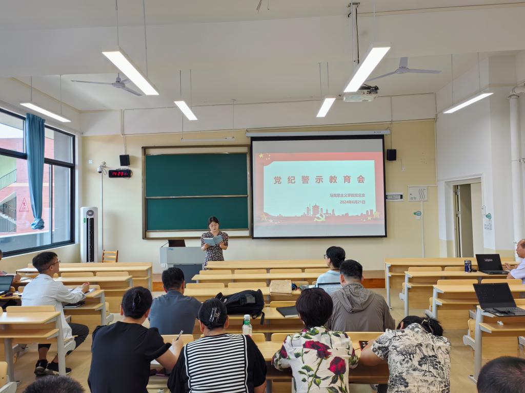 为全面落实党中央从严治党要求,增强党员法纪观念,建设清廉校园环境,根据学校党委学习工作部署,马克思主义学院党总支于6月21日开展了党纪警示教育专题学习。会议由马克思主义学院党总支书记赵奕主持。