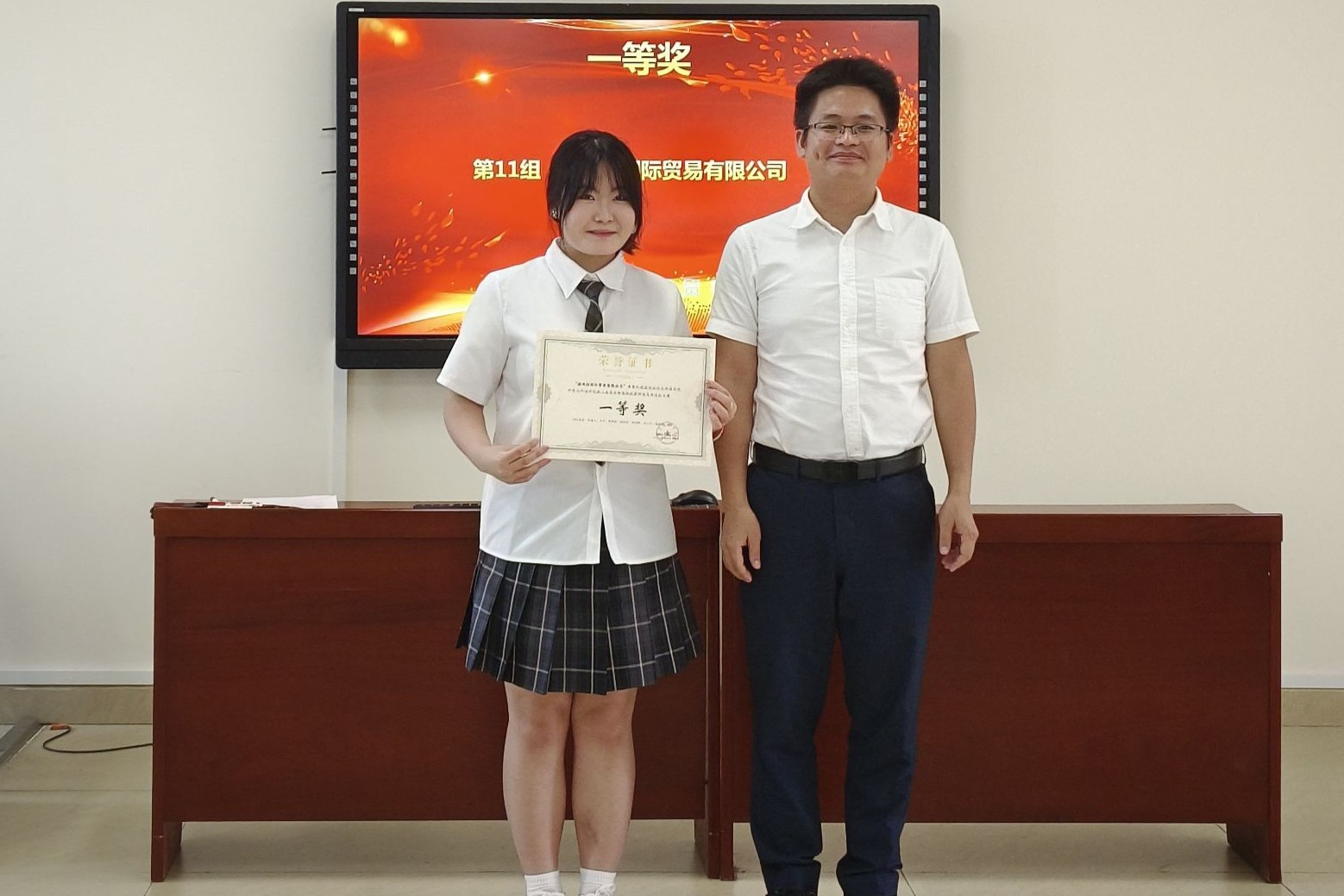 外贸与外语学院副院长、国际合作与交流处副处长赖安老师、国际经济与贸易专业教研室副主任梁瑛老师为获奖选手们颁奖,并从专业角度对选手们的精彩表现进行了点评。
