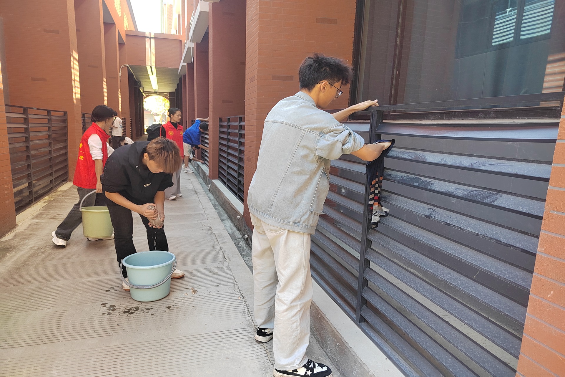 在美化校园环境活动中,志愿者们积极主动擦拭楼梯扶手、消防栓、百叶窗等,他们不怕脏、不怕累,积极投入到环境整治工作中。他们用实际行动践行爱校园、美校园,为学校师生营造一个更加整洁、舒适的学习生活环境。