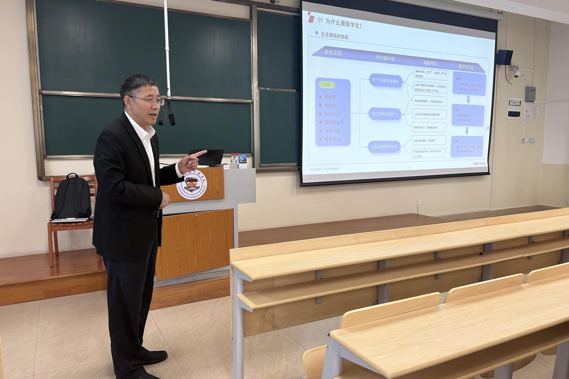 讲座中,许经理以惠州亿纬锂能股份有限公司为例,对“数字化的重要性、数字化定义、数字化规划和架构、数字化路线和趋势”等内容进行了详细讲解。通过许经理的精彩讲解,老师们全方位的了解了企业数字化的最新动态和实际应用,强化了教师的数字化素养与应用能力,激发了教师将数字化思维融入教学,探索课程改革与数字化结合的新路径,从而提高了对前沿科技在企业中应用的理解水平,推动了学校教学质量与企业实践接轨。