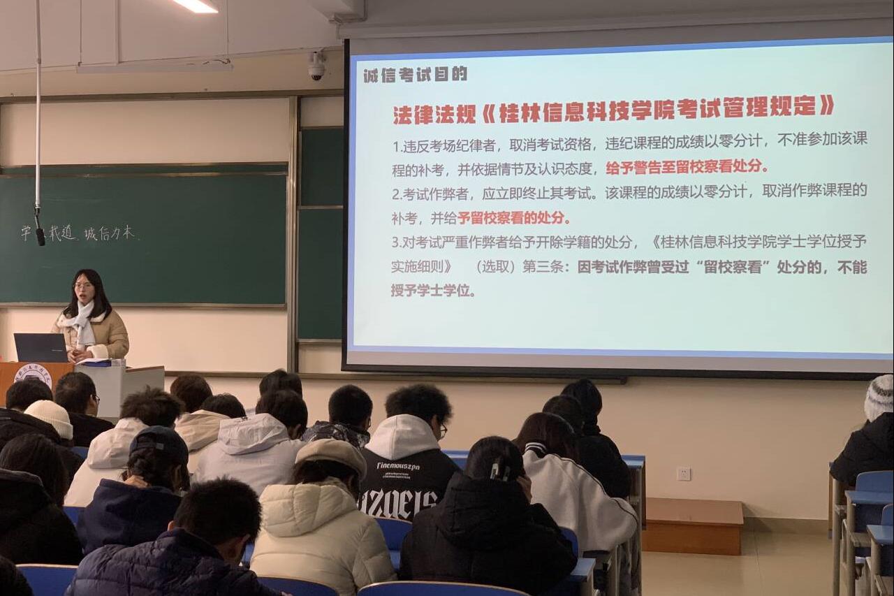 会上,各年级老师向同学们介绍了期末考试及全国大学生英语四六级的时间安排,并通过PPT展示、案例分析等形式,详细解读了关于考试纪律的规定和相关法律法规,强调了诚信考试的重要性及考试作弊的严重后果,教育引导同学们树立正确的考试观念,坚守学术道德底线。同时,老师们还强调期末考试要制定适合自己的复习计划,科学备考,合理安排复习时间,做诚实守信、文明规范的大学生。随后,同学们在《诚信考试承诺书》上签下自己的名字,承诺将以实际行动践行诚信理念,共同维护考试的公平公正。