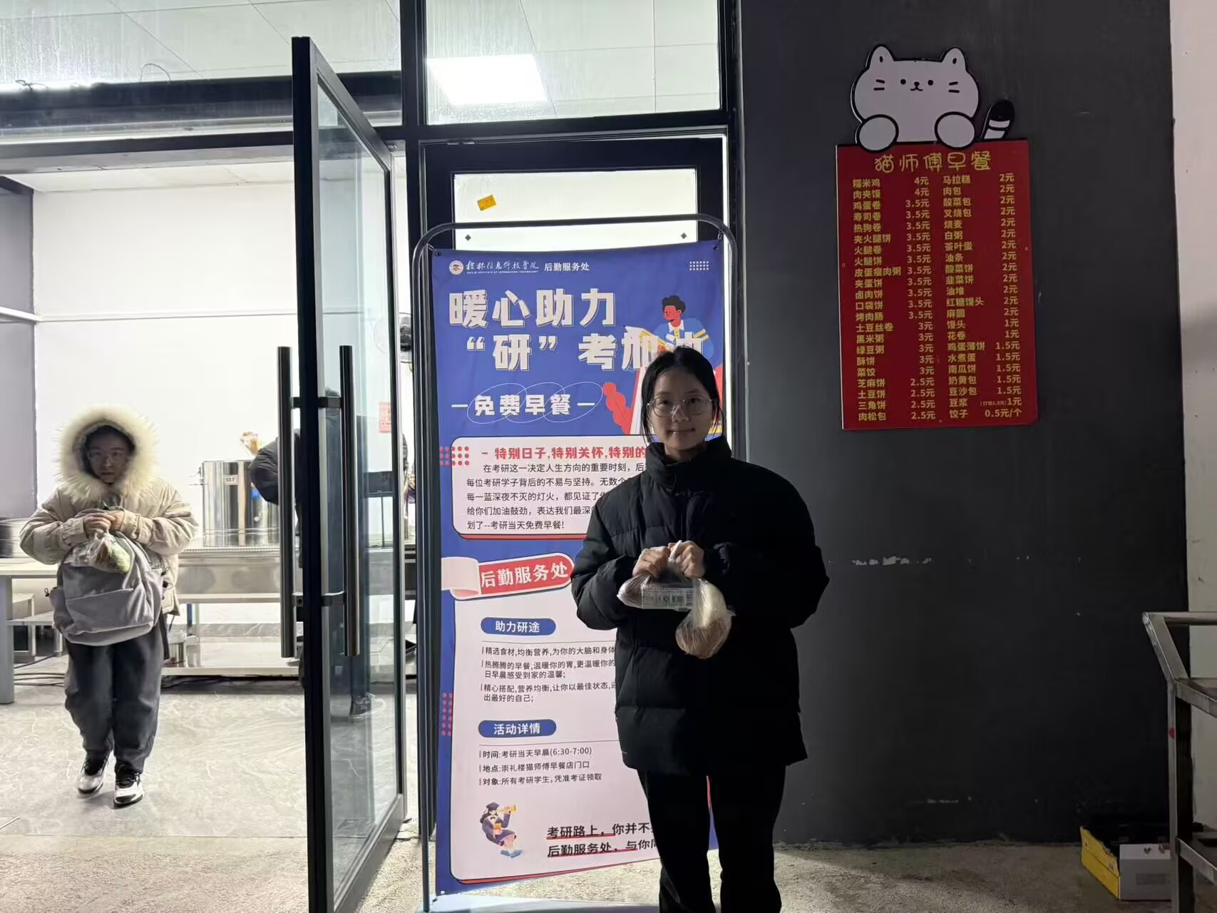 2025年全国硕士研究生招生考试当天,学生发展与服务中心和后勤服务处联合为考研学子准备了免费的“暖心早餐”,包含了营养丰富的餐品,让考生以最佳状态迎接考试。同时,学校安排了考研专车接送服务,确保每位考生安全、准时抵达考点,用贴心服务减轻路途奔波和压力。
