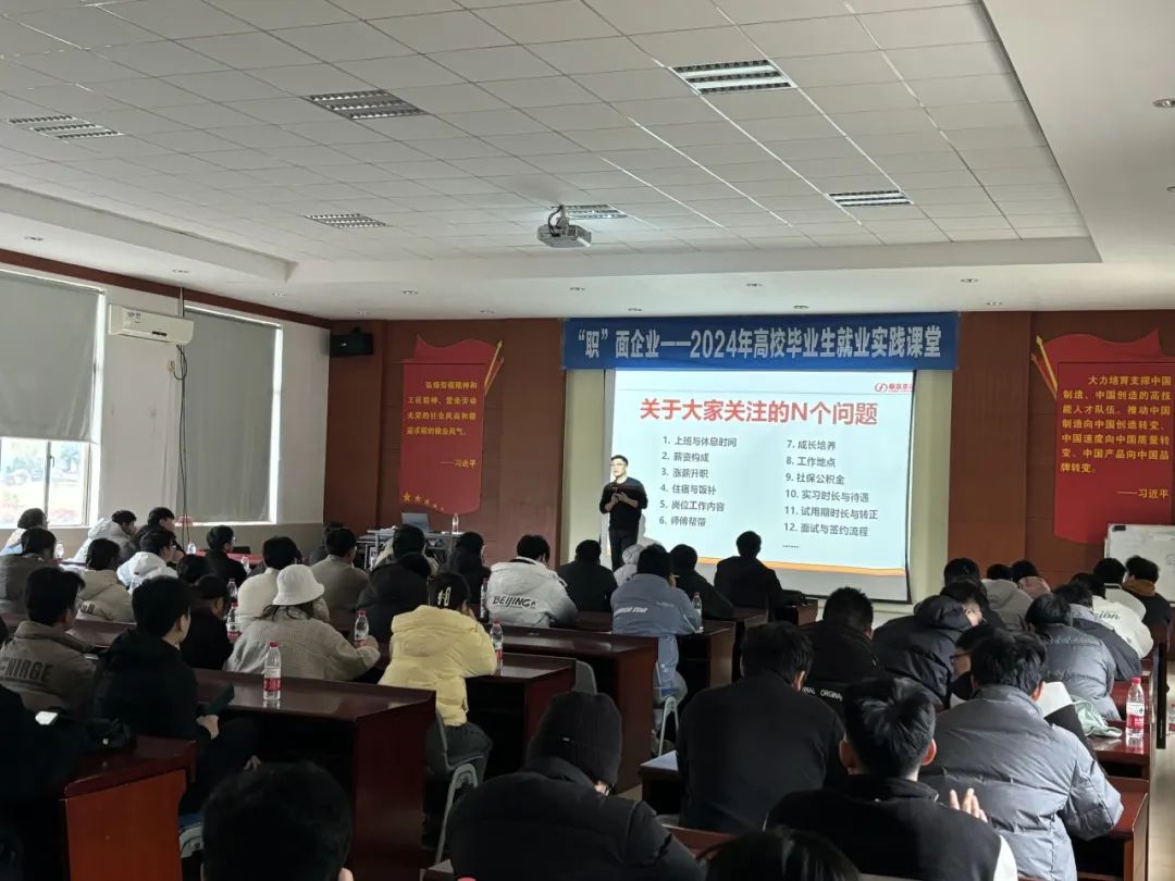 随后,福达股份招聘主管杨博为同学们带来了一场精心准备的招聘宣讲会。他向同学们介绍了福达的发展历程、企业文化、核心价值观以及员工培养体系,并分享了自己的职场经历和成长故事,用亲身经历为同学们描绘了一幅生动的职业规划蓝图。