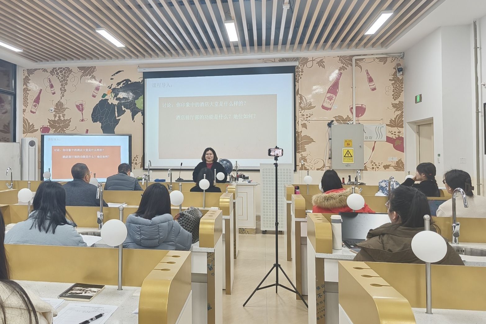 在“磨课”现场,英专教研室的教师们紧扣文学、语言学等专业知识,用生动鲜活的案例为晦涩理论“松绑”,引导学生沉浸式领略英语语言文化的魅力;商英教研室则巧妙融入商务场景模拟,从商务谈判话术到商务文书撰写,让知识在实操情境里迅速 “落地”。国贸和国商教研室的老师们着眼全球贸易格局,借助实时数据、经典贸易案例,深入浅出剖析复杂经贸原理,培养学生敏锐的商业洞察力。酒管教研室把酒店服务实操细节、高端运营理念融入教学环节,仿若置身酒店运营一线。而大英一、大英二教研室聚焦夯实学生基础,创新设计趣味语法游戏、多元主题口语角,为非英语专业学生的语言进阶铺就坦途。而“磨课”活动中的专家点评环节,更是将活动推向高潮。数位校内教学经验丰富、学术造诣深厚的专家认真聆听每一位教师的授课内容,精准捕捉教学亮点与待提升之处。