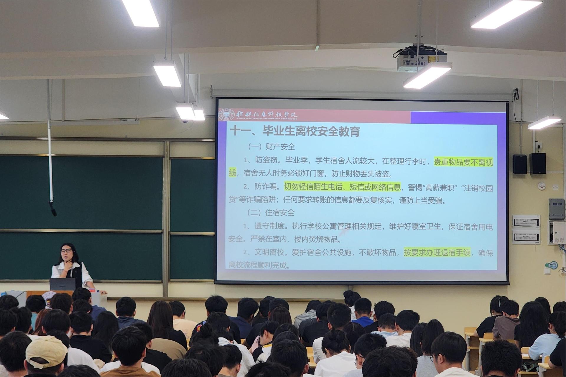 为切实做好毕业生文明离校工作,增强学生安全意识,确保离校期间校园安全稳定。近日,电子工程学院毕业班辅导员组织全体毕业生召开离校安全教育会,通过案例警示、政策解读和暖心寄语,为毕业生上好“最后一堂安全教育课”。