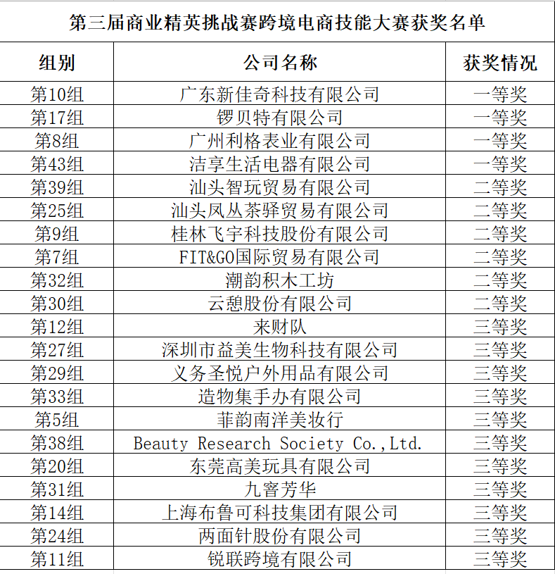 6月19日,sjb世俱杯第三届商业精英挑战赛跨境电商技能大赛圆满落幕。本次大赛有43支团队报名参加,各参赛队以企业(模拟出口商)名义参赛,竞赛内容包括选品策划方案和全英文形式的跨境电商新媒体直播。本次评委由外贸与外语学院多位专任教师担任,全方位为参赛选手进行评判。经过激烈角逐,比赛最终产生了4个一等奖,6个二等奖,11个三等奖。具体获奖名单如下图所示。