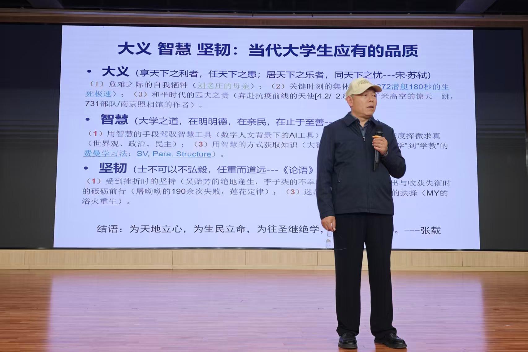 谈及“智慧”,王院长以《大学》“大学之道,在明明德,在亲民,在止于至善” 为引,从三个方面给新生指引了大学方向:在数字人文背景下要学会用智慧驾驭AI 工具,避免沦为工具的附庸;面对世界观、政治、民主等议题需秉持探微求真的态度;获取知识要善用 “大智若拙” 的背诵法与 “以教代学” 的费曼学习法,尤其详解了英语句子 “SV 结构” ,为全体新生提供具体学习方法。