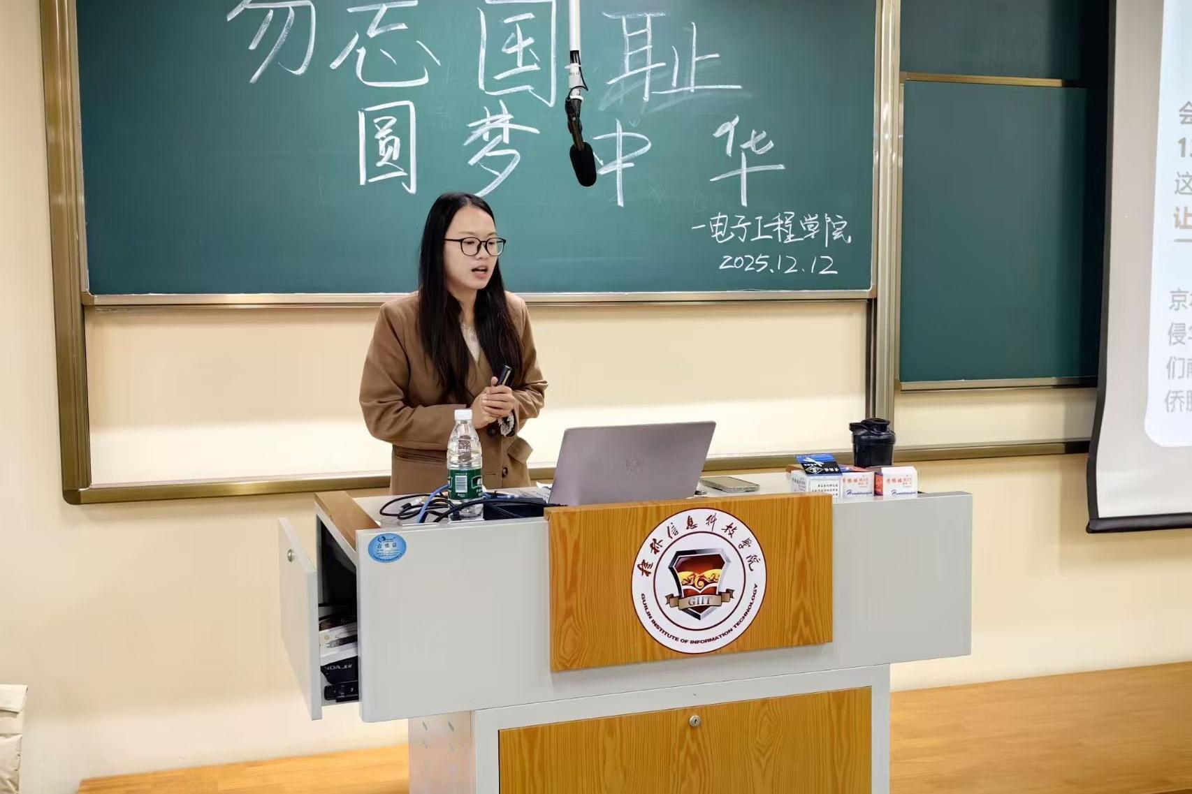 12月12日,电子工程学院在明志楼C409教室举办“勿忘国耻,圆梦中华”主题讲座。学院团委副书记蒋仲琴主讲,120余名学生参与学习。