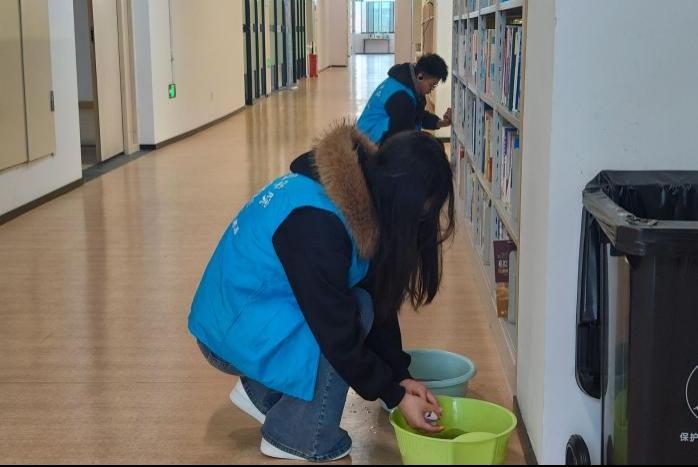 志愿服务过程中,志愿者们分工协作、各司其职、配合默契,用点滴行动诠释新时代青年的志愿担当:一组志愿者专注负责图书整理工作,按照馆藏分类编码耐心细致地对书架上错架、乱架的书籍逐一进行分类、排序、归位,不放过任何一处细小的错漏,有效提升了馆藏图书的规整度与读者找书效率;另一组志愿者则承担起馆内环境维护工作,认真擦拭书架、阅览桌椅表面浮尘,细致清理走廊、转角、书架缝隙等卫生死角,全力为师生营造整洁有序、温馨舒适的阅读学习环境。忙碌的“志愿红”身影穿梭在书架之间,专注的神情、务实的行动,充分展现了新时代大学生的责任与担当,也让志愿者们在亲身劳动中体会服务价值,深刻感悟雷锋精神的时代内涵。