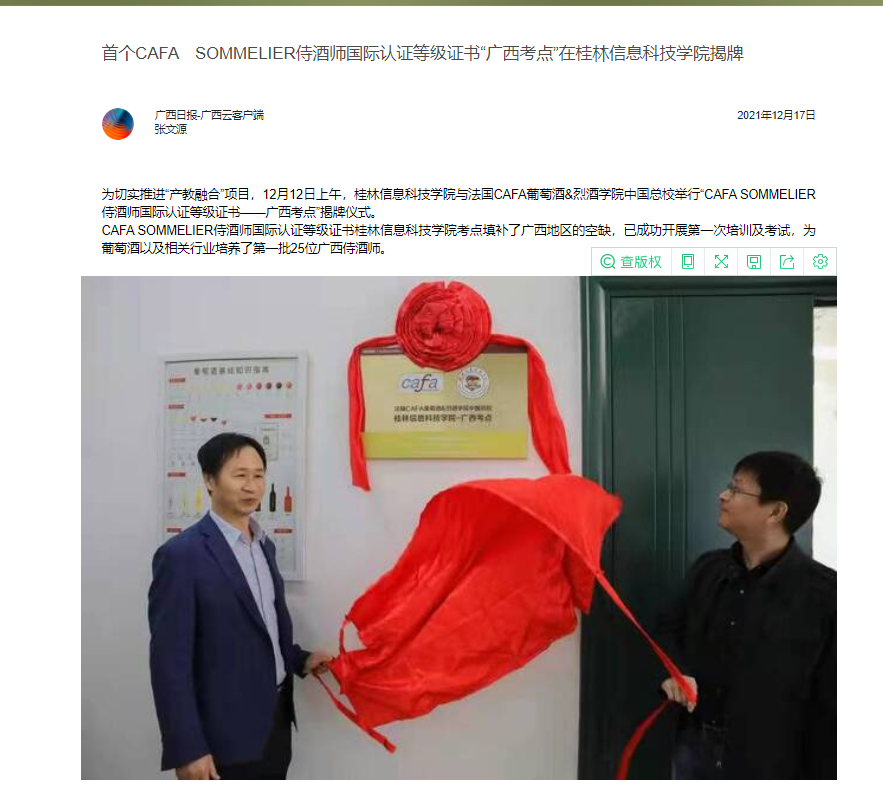 广西云客户端:首个CAFA SOMMELIER侍酒师国际认证等级证书“广西考点”在sjb世俱杯官方网站揭牌