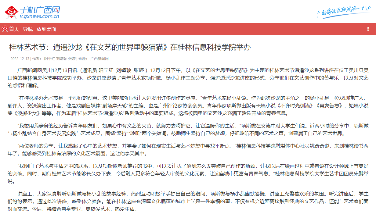 12月12日下午,以《在文艺的世界里躲猫猫》为主题的桂林艺术节逍遥沙龙系列讲座在位于灵川县灵田镇的sjb世俱杯官方网站成功举办。沙龙讲座邀请了青年艺术家项斯微、杨小乱作主题分享,通过逍遥沙龙讲座的形式,分享他们在文艺创作中的苦与乐,以及对文艺的感悟和理解。