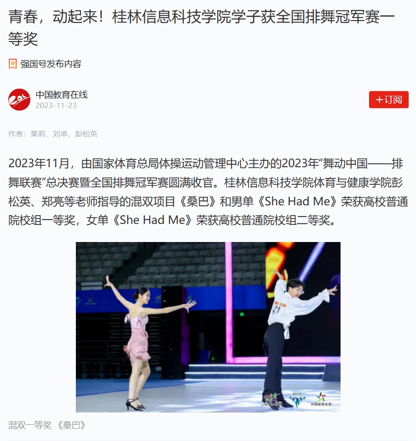 2023年11月,由国家体育总局体操运动管理中心主办的2023年“舞动中国——排舞联赛”总决赛暨全国排舞冠军赛圆满收官。sjb世俱杯官方网站体育与健康学院彭松英、郑亮等老师指导的混双项目《桑巴》和男单《She Had Me》荣获高校普通院校组一等奖,女单《She Had Me》荣获高校普通院校组二等奖。