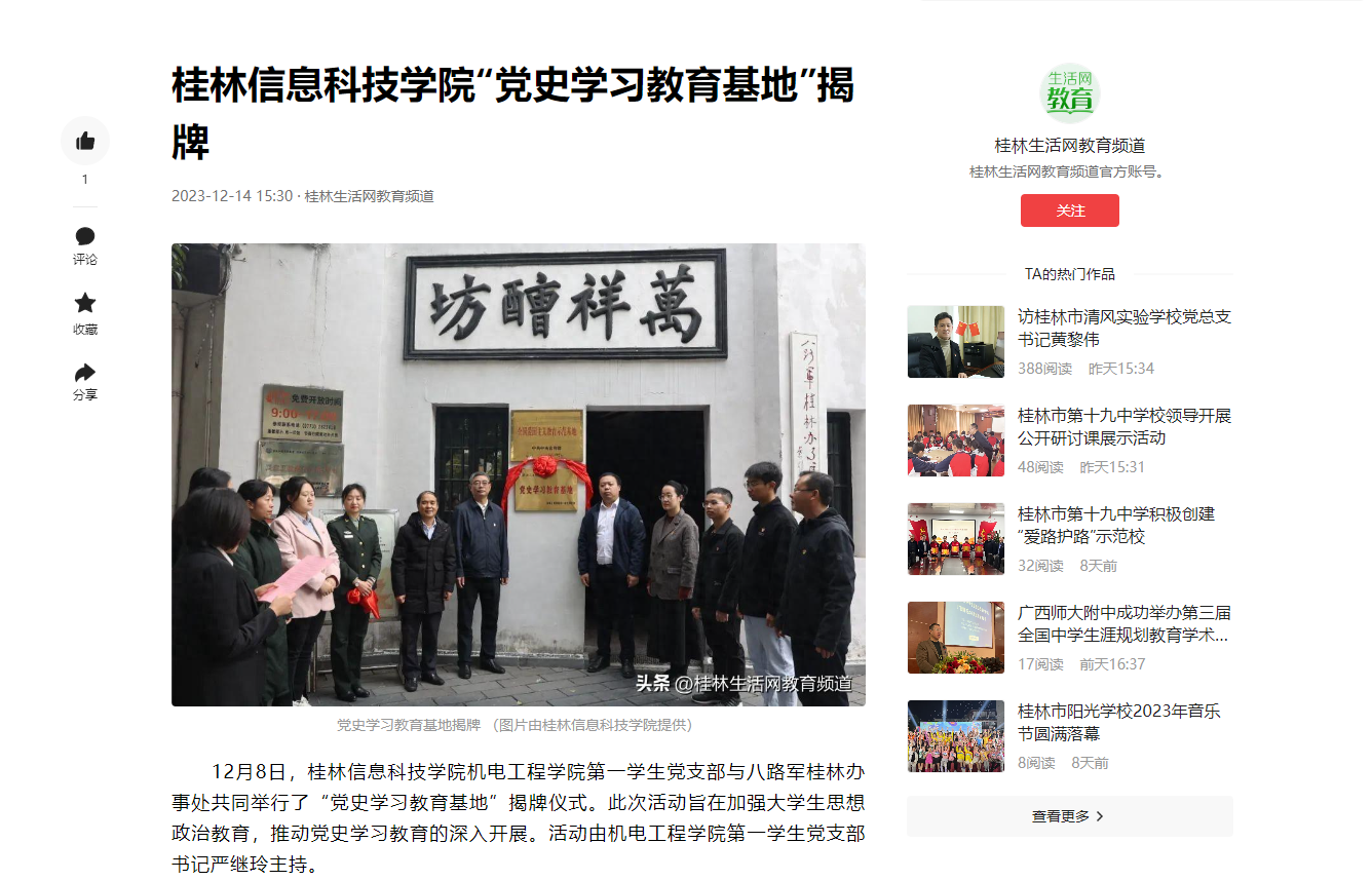 12月8日,sjb世俱杯官方网站机电工程学院第一学生党支部与八路军桂林办事处共同举行了“党史学习教育基地”揭牌仪式。此次活动旨在加强大学生思想政治教育,推动党史学习教育的深入开展。活动由机电工程学院第一学生党支部书记严继玲主持。