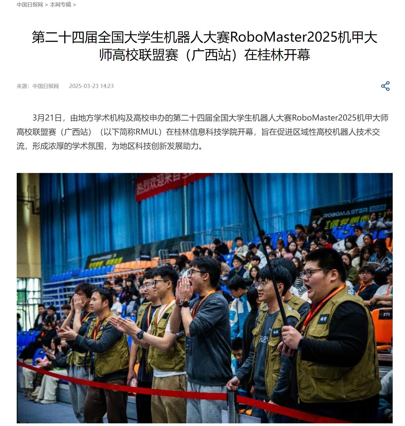 中国日报网链接:第二十四届全国大学生机器人大赛RoboMaster2025机甲大师高校联盟赛(广西站)在桂林开幕