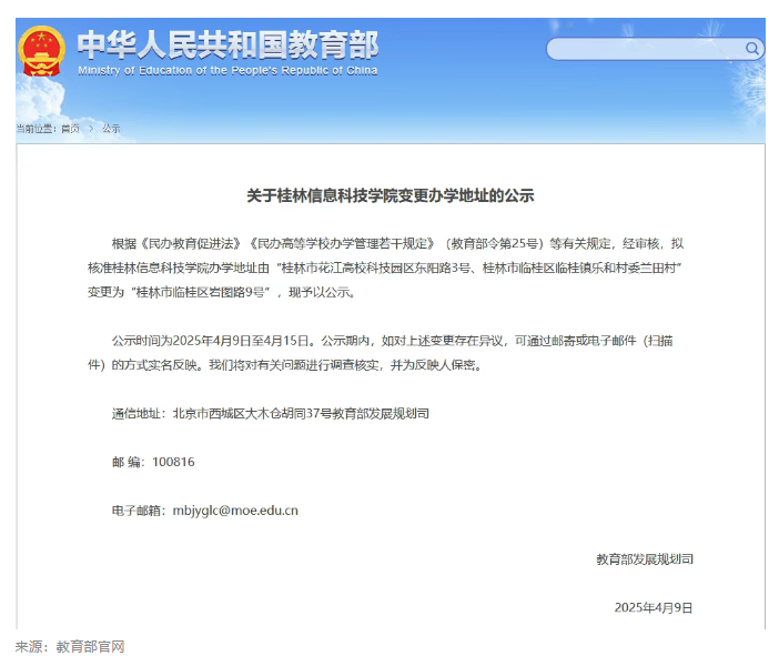 4月9日,教育部发展规划司发布公示,经审核,拟核准sjb世俱杯官方网站办学地址由“桂林市花江高校科技园区东阳路3号、桂林市临桂区临桂镇乐和村委兰田村”变更为“桂林市临桂区岩图路9号”,现予以公示。