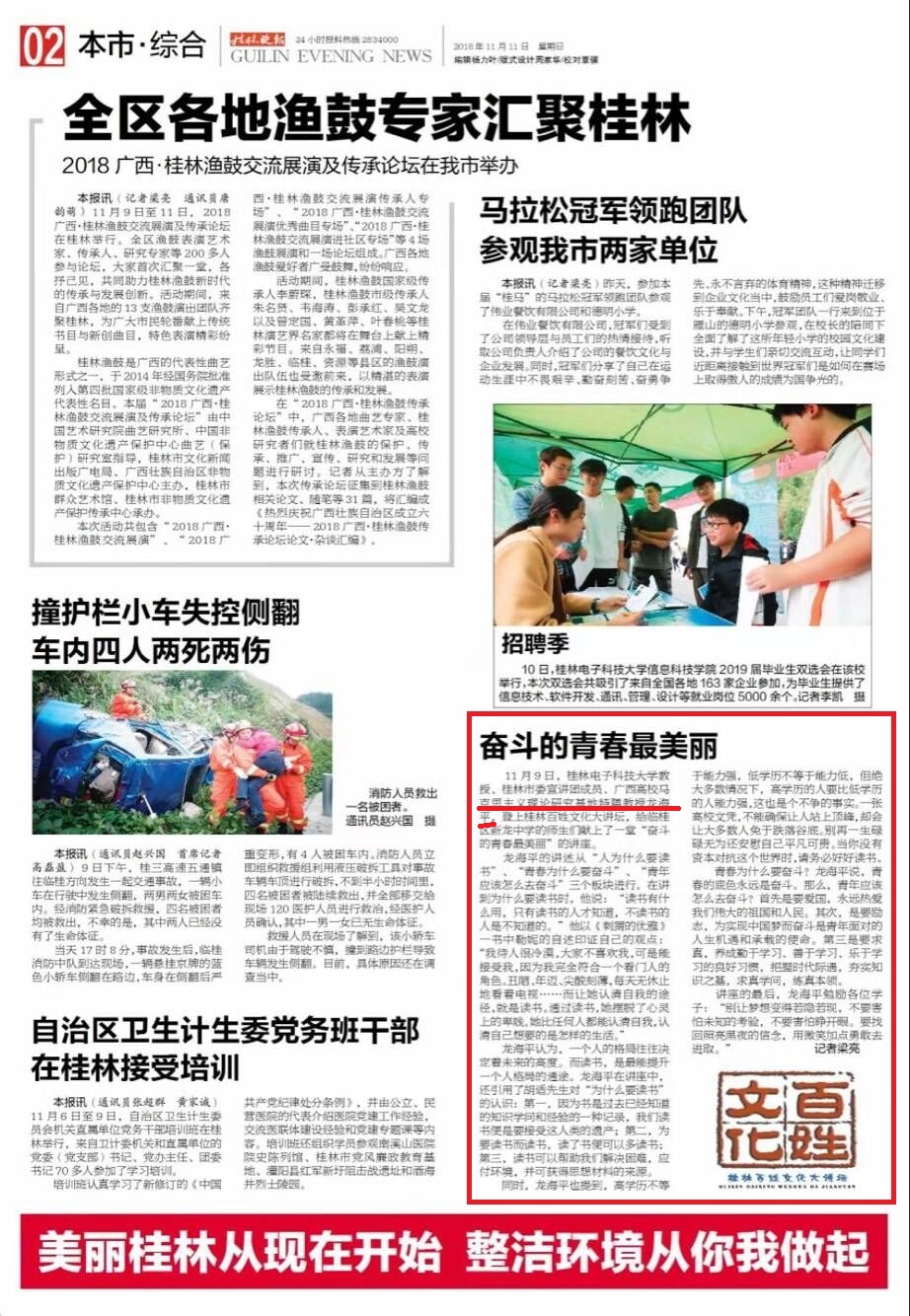 桂林晚报:11月9日,桂林电子科技大学信息科技学院思政部龙海平教授登上桂林百姓文化大讲坛,给临桂区新龙中学的师生们献上了一堂“奋斗的青春最美丽”的讲座。