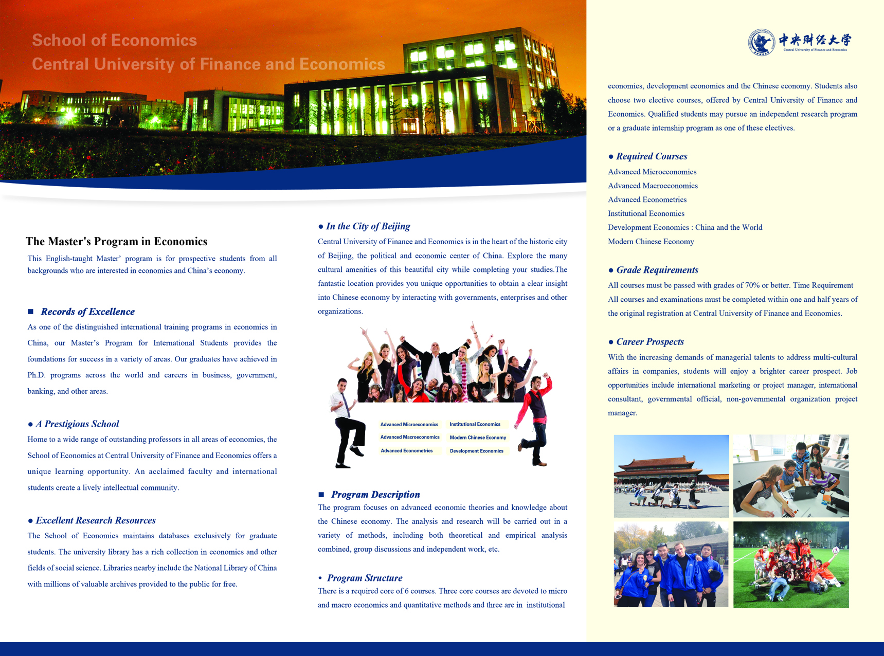 There is a required core of 6 courses. Three core courses are devoted to micro and macro economics and quantitative methods and three are in institutional economics, development economics and the Chinese economy. Students also choose two elective courses, offered by Central University of Finance and Economics. Qualified students may pursue an independent research program or a graduate internship program as one of these electives.